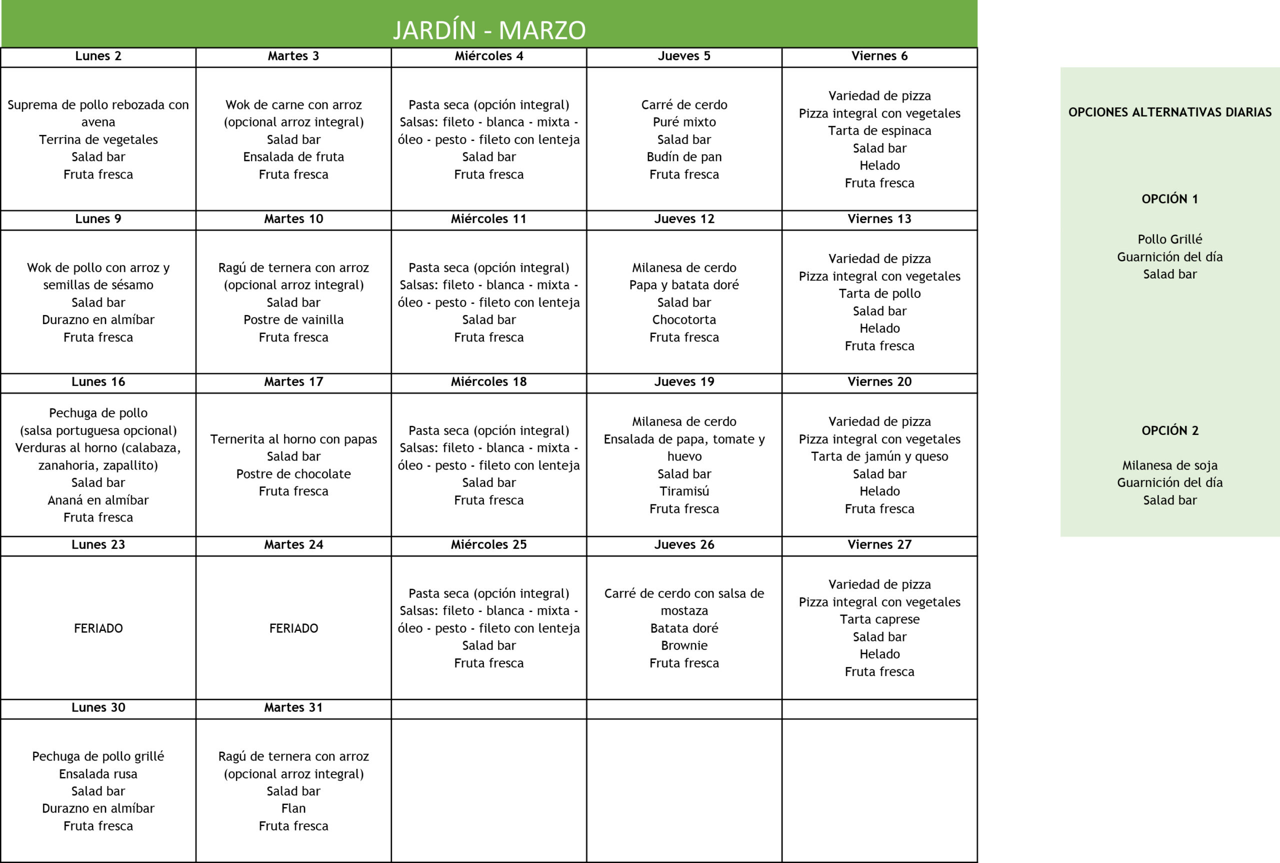 Un postre a elección entre 3 opciones diarias (flan de vainilla, postre de chocolate, helado, duraznos en almibar, muffin, budín de pan, chocotorta, alfajores de maicena, panqueque con dulce de leche)